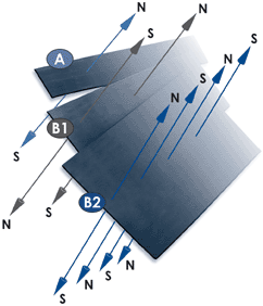 B. Multiple Pole (Standard): Two Poles (B1) or Multiple Poles (B2) on each side - two or more sets of poles on each surface are used in open circuit designs. North and South poles alternate through the thickness of the material. Steel backing is desirable where practical.