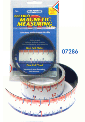 Flexible magnetic strip features standard and metric measurement. Can be used on metal surfaces for hands-free measuring. One meter long with UV-resistant red and blue ink on white vinyl surface.