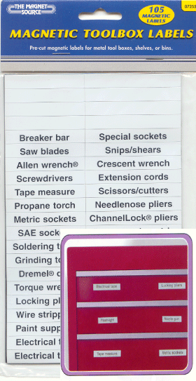 Save time looking for tools and parts. These printed labels are easy to read, and ideal for do-it-yourselfers, mechanics and carpenters. 105 labels are pre-cut. Includes blank labels for easy customization. Use on metal toolboxes, shelves or storage bins.